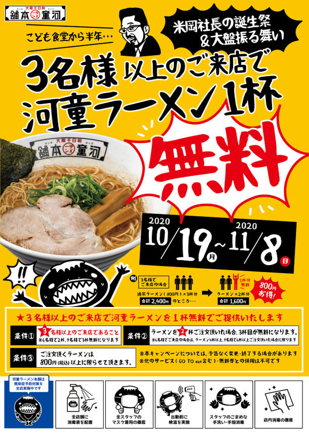 2020年10月19日(月)から11月8日(日)までの約3週間、代表取締役の米岡誕生祭と称して「3名様以上のご来店で河童ラーメン1杯無料!」キャンペーンを行います。