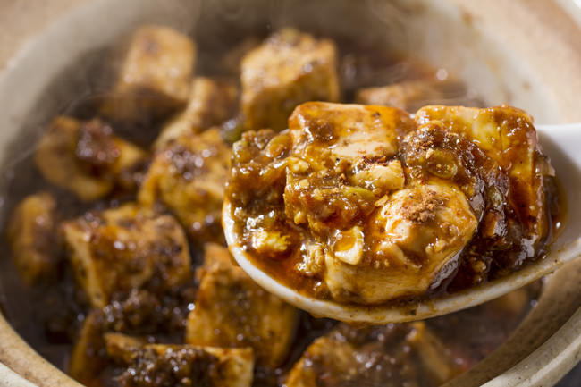 味の決め手となる肉味噌「炸醤(ジャージャン)」は牛挽肉を使用し、鶏ガラスープには鶏の旨味が強く濃厚な味わいの手羽先と”旨味のかたまり”の干し貝柱を入れて深みのあるコクをプラスしました。唐辛子は鷹の爪の3倍といわれるキレのある辛みを持つBIRD EYE、山椒は赤山椒と花椒の2種類を使用。「香り」と「痺れ」の絶妙なバランスがクセになる味わいを作りだします。本格的な四川麻婆豆腐の完成です。