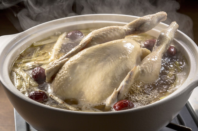 国産若鶏を丸ごと1羽、圧力鍋でホロホロになるまで煮込みました。家族で楽しめるよう薬膳の印象を抑え、スパイスが豊かに香る、味わい深いスープに仕上がっています。じっくり煮込んだ鶏ガラスープには手羽先も入れており、濃厚さと旨味、コク、奥深さが加わっています。みんなでシェアする、体の温まる優しいスープです。