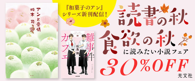 累計で80万部を突破した、坂木 司さんの大人気小説シリーズ「和菓子のアン」。その第三弾となる『アンと愛情』の電子書籍が10月21日(水)に光文社より配信されます。発売を記念して、食欲をそそる小説や読書の秋におすすめの小説51点が30%オフになるキャンペーンを、主要各電子書店で10月21日(水)から開催します。