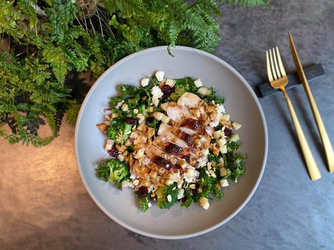 鶏ムネ肉、ケール、ブロッコリー、りんご、クルミ、カッテージチーズ、赤タマネギ、ドライクランベリー、オーツ麦
