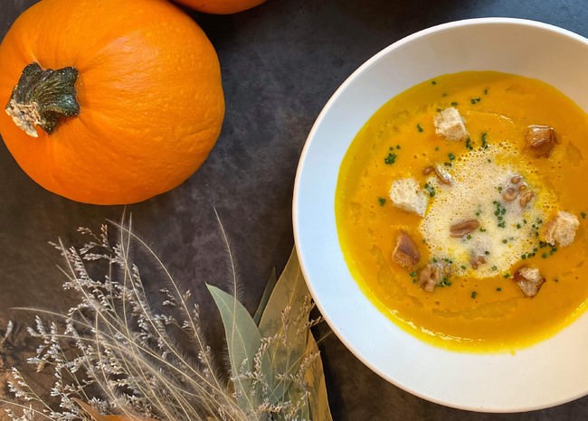 かぼちゃ、ヘーゼルナッツオイル、クルトン