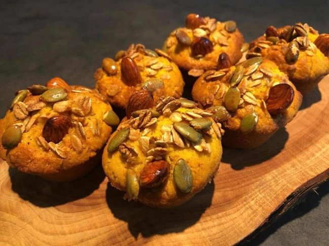 ケール、りんご、クルミ、カッテージチーズ、オーツ麦など、8種類の野菜や果物、ナッツの上に、鶏むね肉のグリルチキンがたっぷり乗った「CHICKEN POWER BOWL」。炭水化物抜きでもしっかりお腹いっぱいになる、動物性・植物性の栄養素が一気に摂れる一品です。もう一つは、旬のかぼちゃの自然な甘みであったまるスープ。アクセントにヘーゼルナッツが香る、寒くなってきた季節にぴったりのランチ。パン(税抜価格 100円)をプラスして、スープランチセットにもできます。「PUMPKIN VEGAN MUFFIN」など、ノンシュガーのヴィーガン対応スイーツで、甘いもの好きな方でもヘルシーに楽しめるスイーツも自家製です。