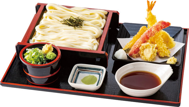 冬の海鮮天ぷら(帆立、カニカマ、海老、イトヨリ、イカ、ピーマン、かぼちゃ)と「ざるうどん」のセット。旬の食材を使用した揚げたてサクサクの天ぷらに、モチモチとした食感で、のどごしの良い「ざるうどん」がよく合います!