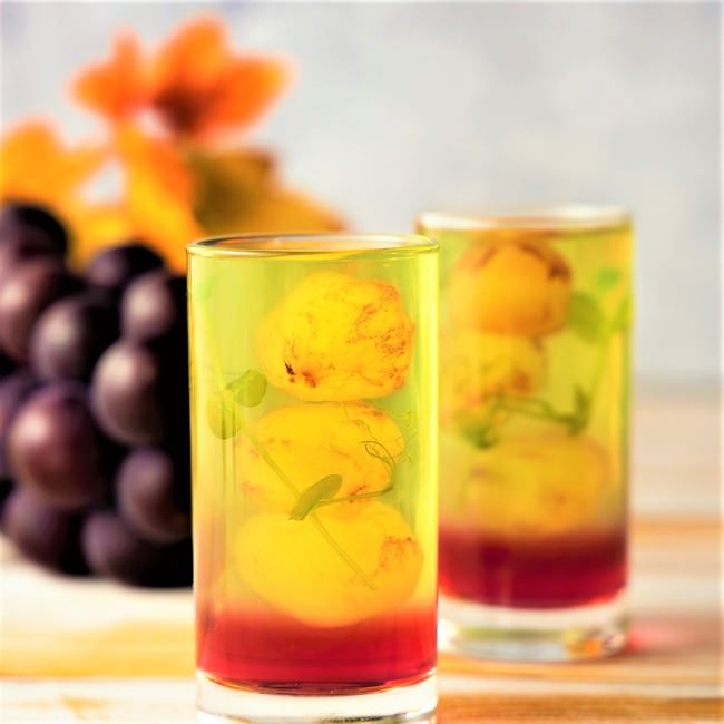 贅沢にフレッシュな巨峰を丸ごとゼリーで閉じ込めた、葡萄のフレッシュな美味しさはじける1品。葡萄の1粒1粒が繋がっている姿から名付けたグラススイーツです。
