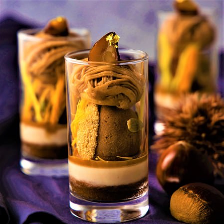 マロンのパンナコッタとマドレーヌにモンブラン、小麦の帽子のような見た目と山のような渋皮煮の、見た目も楽しい1品。自然とライフスタイルの共存をイメージして、秋の里山を表現しています。
