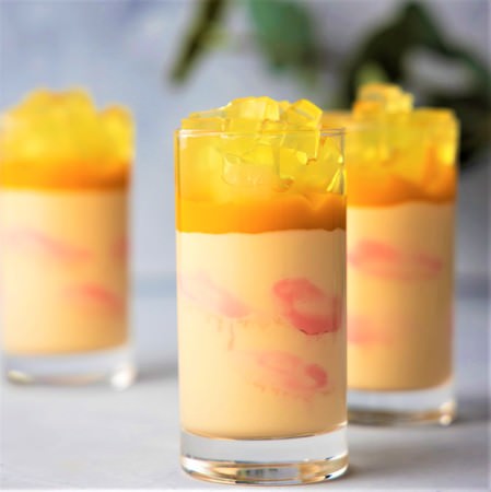 下から、洋梨のムース、ルビーチョコレート、マンゴーゼリー、洋梨のジュレ、ラ・フランスのコンポートの層で仕上げました。思いやりや優しさを表現しています。