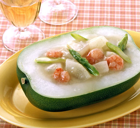 ▲『姫トウガン』の小海老と アスパラコンソメあんかけ果実は切り抜いて器に♪