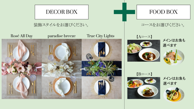 OUR HOUR at Home はご利用日に合わせて、装飾・食器が入ったDECOR BOX と、本格的なフレンチのコース料理の入ったFOOD BOX を、ご自宅にまとめてお届けするサービスです。ホームウェディングをはじめとした、お祝いごとがご自宅で気軽に体験できます。