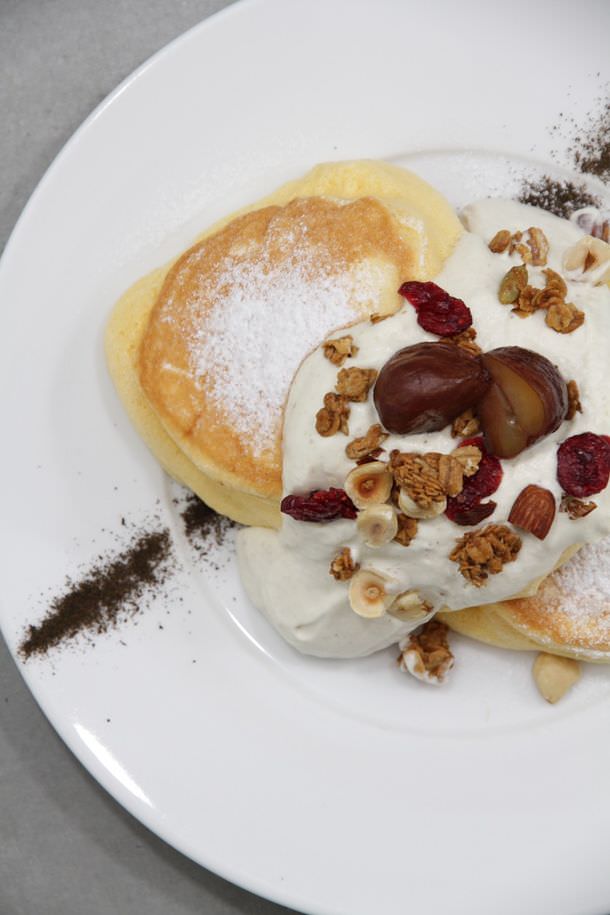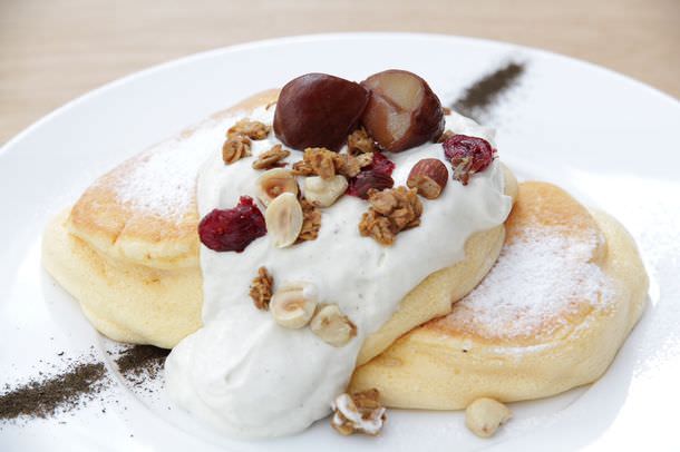 国産の和栗をたっぷりと使いまさにモンブランの名にふさわしい贅沢なパンケーキに仕上げました。濃厚な和栗の美味しさと、クランベリーの酸味そして、ヘーゼルナッツの食感とアールグレイの香りをお楽しみください。