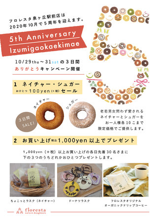 フロレスタ泉ヶ丘駅前店では、本日10/29〜31まで、オープン5周年を記念してありがとうキャンペーンを開催します。