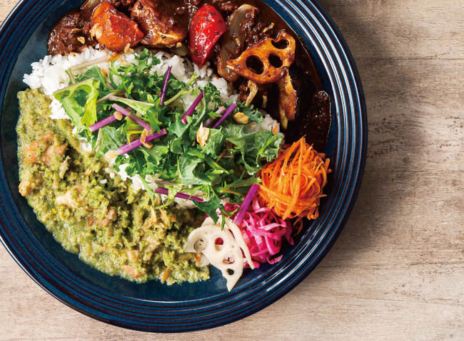 野菜を食べるカレーcampでは2020年9月に“野菜の食べ方をもっと楽しむ”をテーマにグランドメニューをリニューアルいたしました。そこで新たに仲間入りした2種類のカレーを一度に楽しめる「あいがけカレー」。