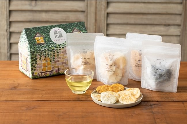 コラボレーションする『SENBEI BROTHERS』は、「せんべいを、おいしく、かっこよく。」をコンセプトに魅力的なパッケージとバジルやトリュフ塩など特徴的な味で話題のせんべいブランド。今回のコラボレーションでは、直営の通販サイトや取扱店舗では売り切れが続出する本ブランドの商品から3種類のせんべいをアソートしました。また、せんべいに合わせて特別にブレンドした『okucoco』限定「SENBEI BROTHERS監修シトラスグリーンティー」も同封しています。