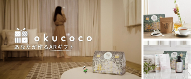 『okucoco』は2019年12月にサービスを開始。「喜ばれるギフトを自分で作る」をテーマにおしゃれな商品とARオリジナルメッセージをセットにしたギフトを提供し、テレビでも紹介されるなど話題となっています。贈ることができる商品は、今回の「センベイ3種類&シトラスグリーンティーセット」のほかに「TEA~紅茶5種セット~」、「BODY CARE~ボディソープ&バスソルト2種セット~」をご用意しています。最大の特徴は“自分で作れる”自分だけのARメッセージをスマートフォンで簡単に作成して添えられること。上記の商品が入ったギフトボックスにスマートフォンをかざすと贈り手の顔をした3Dキャラクターが登場し、花火とともにメッセージを伝えます。ARという最新技術と昔ながらの温かいメッセージを融合することで誰にでも喜ばれ、今までにない感動を与えるギフトをお届けします。