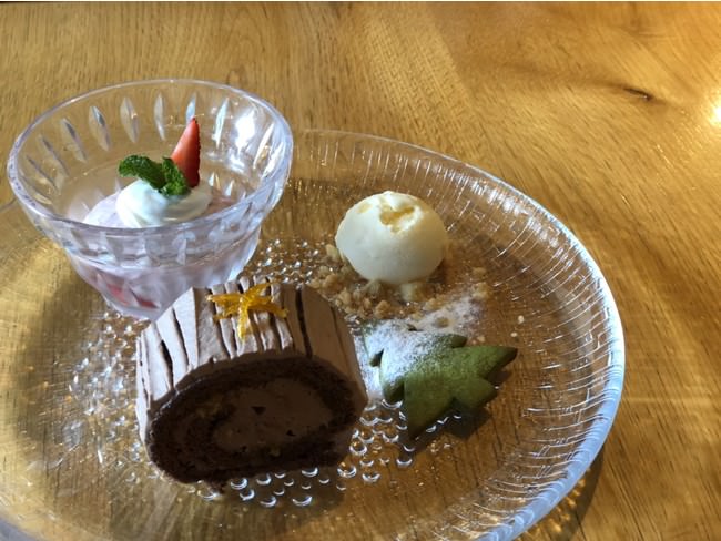 - チョコとオレンジのロールケーキとイチゴとヨーグルトのムース