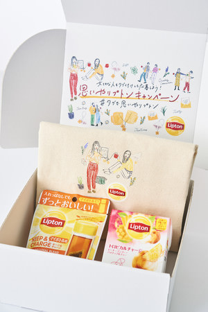 「思いやリプトンギフトボックス」は、今回のプロジェクトのために特別にデザインしたギフトボックスに、オリジナルデザインのトートバッグとリプトンの紅茶製品をセットにしてお届けします。紅茶は、2つのコンセプトに合わせ、2種類の紅茶をセットにしてご用意いたしました。トートバッグとギフトボックスは、itabamoeさんによって、手書きの柔らかなタッチでリプトンらしい明るい紅茶の世界観と紅茶を通した大切な人とのつながりを表現いただいたオリジナルデザインです。仕事を頑張る同僚、年末年始の帰省で会いたい家族、クリスマスのちょっとしたプレゼント、そしてもちろん自分へのご褒美としても、贈る相手やシーンに合わせてコンセプトを選んで、大切な人を思いやる気持ちを届けてみてはいかがでしょうか。