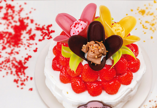 ブランドのシンボル「チューリップローズ」の花が咲きみだれる、まるで“天空の花園”のようなゴージャスな一品。2つの味を一度に楽しめる、とってもよくばりな“ダブルショートケーキ”です。