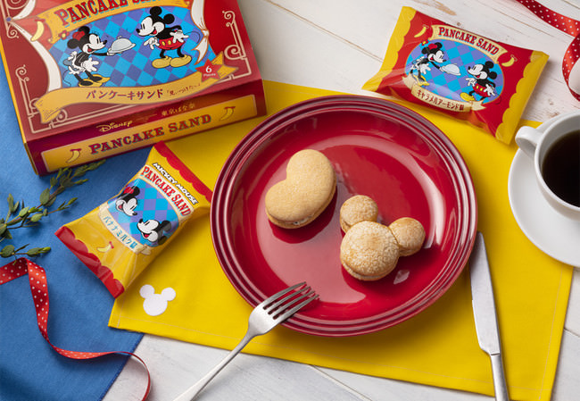 ミッキーフェイスデザインはキャラメル香るパンケーキに、ローストアーモンドを刻み入れたキャラメルクリームをはさんだ“香ばしナッツのキャラメル味”。