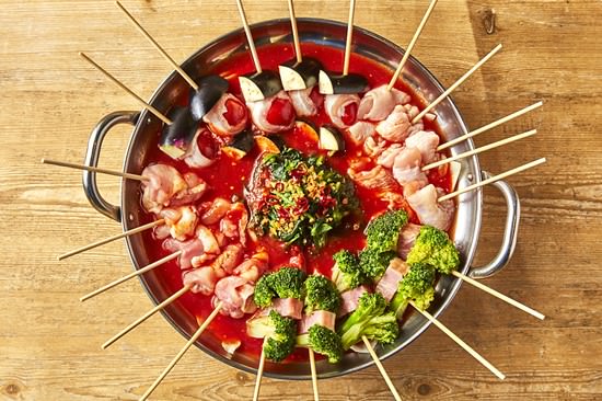 味も見た目も安心で楽しい!鍋の具材が串になっている新感覚なお鍋です。大山どり、ベーコン、トマト肉巻、もちもちベーコン、ブロッコリー、ナス、ほうれん草、キャベツ等、バラエティー豊かなヘルシー素材がたっぷり。徐々にチーズが溶け出す濃厚トマトチーズスープをディップしていただく、チーズフォンデュ感覚のお鍋です。煮詰める毎にスープが濃厚になりますので初めはさっぱり、後半はチーズたっぷり濃厚鍋に変化します。