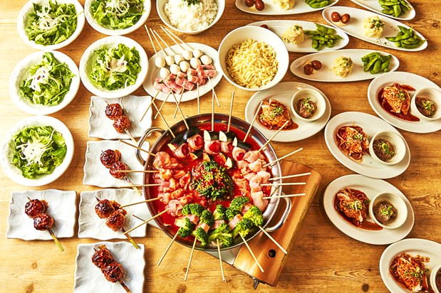 1人前からオーダーできる(従来は2人前~)『やきとり家すみれ』の人気串を大胆にトマトとチーズで作ったイタリアンなお鍋にIN。