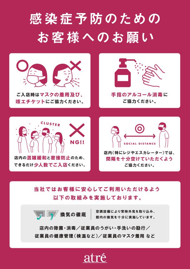 アトレでは、お客さま、従業員及び関係者の皆様の安全性を考慮し、新型コロナウイルス感染拡大防止の為の対策を講じます。また、来店されるお客さまへのご協力のお願いがございます。