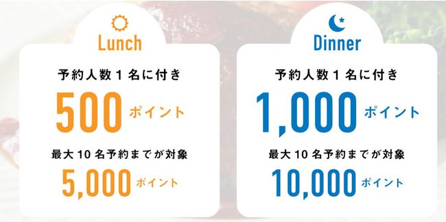キャンペーン期間中にfavyもしくはトレタかんたんウェブ予約対象店舗の予約を行うと、1回の予約につき最大10,000ポイントの「Eatポイント」をプレゼントするキャンペーンです。ランチは予約人数1名につき500円、最大10名5,000まで、ディナーは予約人数1名につき1,000円、最大10名10,000までポイントが付与されます。