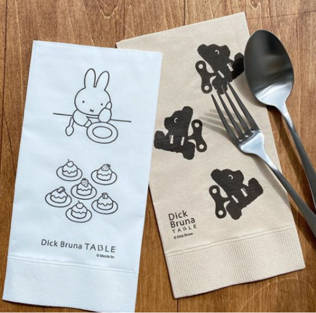 店内で使用しているカトラリーやペーパーアイテムはすべてオリジナルグッズ。飲食と会話を楽しんだ後は、神戸のお土産として購入することも可能です。10月1日よりオリジナルナプキンが新登場。ミッフィーはホワイト地、ブラック・ベアはクラフト地と雰囲気の異なる2タイプ展開です。店内での飲食時に提供するほか、2Fレジ横のショップで購入もできます。 各20枚入り ¥650(+10% 715 円)