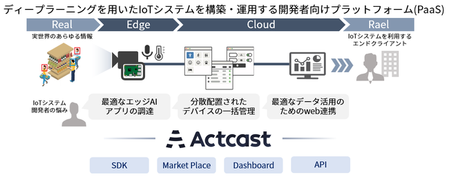 Actcastは、エッジデバイス上で画像解析AIなどを実⾏して実世界の情報を取得し、Webと連携するIoTシステムを構築・運⽤する為のプラットフォームサービスです。安価なデバイスを用いてエッジ側で解析を⾏い、不要な情報を送信しない事によって運⽤コストを⼤幅に削減し、プライバシーへの配慮も行いながらAIの普及を実現します。セキュリティ、産業IoT、リテールマーケティング、MaaSなど様々な分野でご利⽤いただく事が可能です。