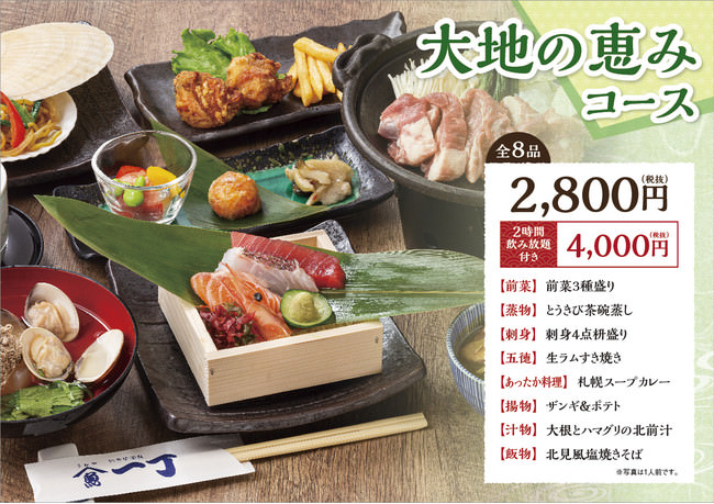 おすすめの「大地の恵みコース」は、とうきびの茶碗蒸しや、札幌スープカレー、生ラムすき焼きなど、「魚や一丁」ならではの北海道料理を、2時間飲み放題付き4,000円のリーズナブルな価格でお楽しみいただけます。そのほか、気軽にご利用いただける「ご縁会にぴたっとコース」3,500円、北海道の海の幸、山の幸が両方味わえる「北海道トコトンたんのうコース」4,546円、ズワイガニやウニ、イクラなどを楽しめる贅沢な「北海道の恵コース」5,000円もご用意しています。