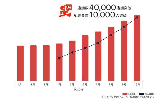 2020年11月に入り、『出前館』の加盟店舗数が40,000店舗を突破し、会員数も600万人を超え、今まで以上に多くのお客さまにご利用いただいております。『出前館』は、”デリバリーの日常化”を実現するため、2022年中に加盟店舗数を100,000店へ拡大します。さらに、今年4月に約4,000人だった、『出前館』のシェアリングデリバリー®(配達代行)の配達員は、現在約10,000人を超え、半年で2倍以上になっております。今後、さらに拡大していく「シェアリングデリバリー®」の配達拠点増加とともに、より良い配達品質を追求し、「身だしなみ」「正確な時間にお届け」「できたてをお届け」の3点に重きを置き、全国に拡がる配達拠点で教育を行い、他サービスとの差別化を図っていきます。