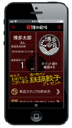 屋台屋 博多劇場では2016年10月から公式会員アプリ運用を開始し、会員サービスを浸透させ、継続した会員化でリピーターを獲得してまいりました。来店時にアプリをダウンロードし会員になる※と、来店ごとにスタンプが貯まり、スタンプ数に応じて特典を獲得できます。また、期間限定イベントやフェア等のお得な情報をプッシュ通知機能で入手できます。