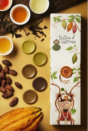 パッケージは「幸せのボタン」と同じく松並良仁氏のデザインによるもの。実は、12月に発売予定の小山の新作絵本『ショコラ―タはかせとしあわせのボンボンショコラ』(フレーベル館)に登場するボンボンショコラがこのショコラなのです。