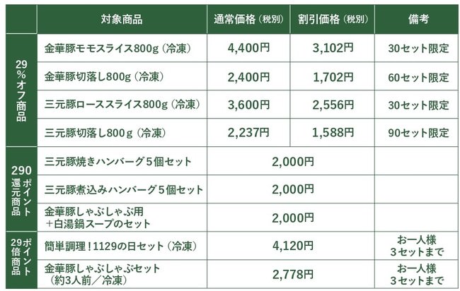 11月29日は年に一度の“いい肉の日”。美味しく、そして安全で安心な“いい豚肉”を消費者の皆様にお届けするため、養豚生産から食肉加工、加工肉製造、流通、外食小売まで一貫経営している当社、平田牧場を日頃ご愛顧頂いてる皆様へ感謝の意を込め、対象商品を29%以上の割引価格でご提供する、大変お得なお客様還元キャンペーンを実施します。日頃、ご愛顧頂いてる皆様はもとより、初めてご利用頂くお客様も、このお得なキャンペーンを通して、本物の“いい豚肉”をご賞味を頂ければ幸いです。