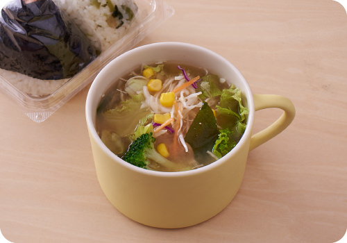 ■オフィスランチでぜひ!マグカップで作る「コンビニサラダの取り分けみそ汁」