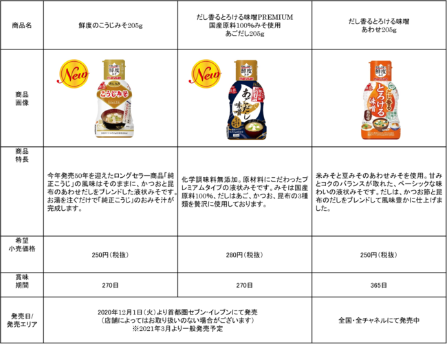 マルサンアイ株式会社(本社:愛知県岡崎市 代表取締役:渡辺邦康)は、「鮮度のこうじみそ205g」、「だし香るとろける味噌PREMIUM国産原料100%みそ使用あごだし205g」を2020年12月1日(火)より、首都圏のセブン-イレブンにて発売いたします。※店舗によってはお取り扱いのない場合がございます。
