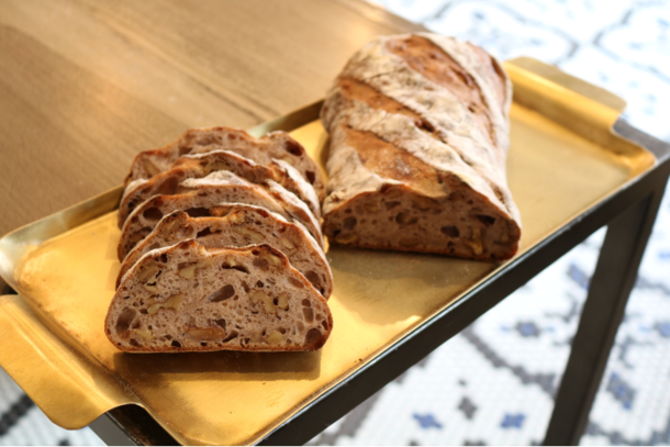 サワー種を使用した生地にカリフォルニア産のくるみをたっぷりと加え、石窯の豊富な熱で包み込むように焼きあげました。かみしめるほどに生地の旨みとくるみの香ばしさが広がります。
