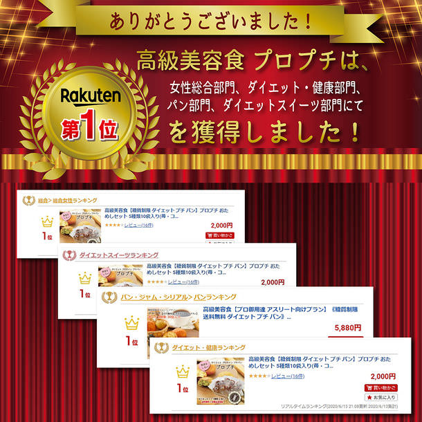 この体に大切な“たんぱく質”と“カルシウム”を摂りながらダイエットができるのがダイエット プロテイン プチパン『プロプチ』です。プロプチは発売から1年2ヶ月で、楽天市場にて女性総合部門、ダイエット・健康部門、パン部門、ダイエットスイーツ部門の4部門で1位を獲得した人気のプロテイン食品です。