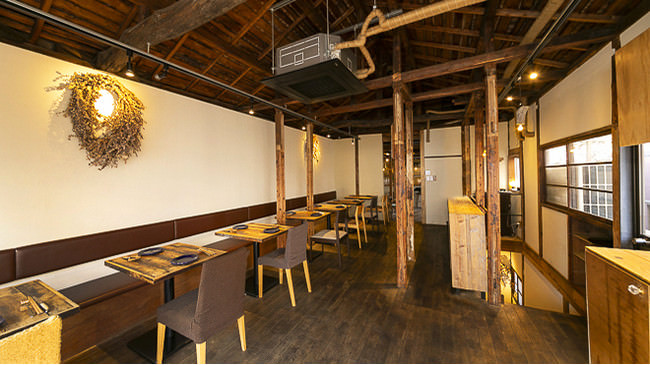 古民家を改築した居心地の良い空間。あたたかみのあるウッディな家具とオレンジ色の光にほっと癒されながら、くつろぎの時間を過ごせます。
