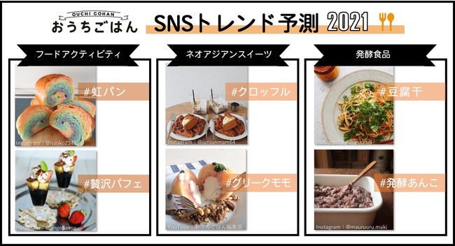 このことから、「フードアクティビティ」、「ネオアジアンスイーツ」、「発酵食品」の3つを軸とし、2021年のおうちごはんSNSトレンドワードを予測しました。