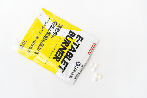 「E-TABLET BURNER(イータブレットバーナー)」はヒドロキシクエン酸(HCA)※1を機能性関与成分とした機能性表示食品です。ヒドロキシクエン酸は、運動時のエネルギー源として糖質よりも体脂肪の活用を促すことで、運動時の脂肪燃焼を高めます。臨床試験においては、運動時の呼吸交換比を低減させる(運動時にエネルギー源として脂肪を使っている割合が高くなる)ことが確認されています※2。当社は、ヒドロキシクエン酸の研究を20年以上続けており、培ってきた技術や知見を基に、飲みやすいタブレットタイプの当製品を開発いたしました。
