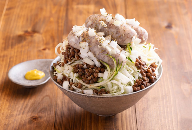 <サルシッチャ(イタリア産⽣ソーセージ)とレンズ⾖の和からし添え>