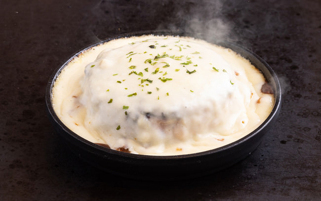 まるでケーキかのような⾼さのあるお好み焼きに、本場スイスのチーズと⽜乳を合わせた濃厚チーズフォンデュソースをたっぷりとかけた⼀品。お好み焼きには、⼭芋と⻑芋の2種類の芋を使⽤することにより、ふわっと柔らかい⾷感に仕上げました。
