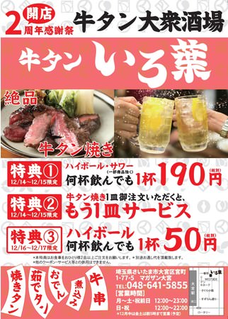 「大宮牛タンいろ葉」(運営:株式会社シーズン2、本社:東京都渋谷区)は、オープン2周年記念として、12月14~17日の4日間限定で、『①ファーストオーダーで牛タン焼きを頼むともう一皿無料!』、『②何杯飲んでも生ビール・ハイボール・サワー何杯飲んでも1杯190円!』、『ハイボール何杯飲んでも1杯50円!』を実施いたします。