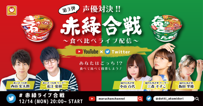 赤いきつね緑のたぬきTVCMに声で出演している、花江夏樹さん・三森すずこさんに加え、スペシャルサポーターとして、飯田里穂さん・西山宏太朗さん・小山百代さんがライブ配信に参加します。また、配信に合わせてTwitter上にて投票キャンペーンを実施します。