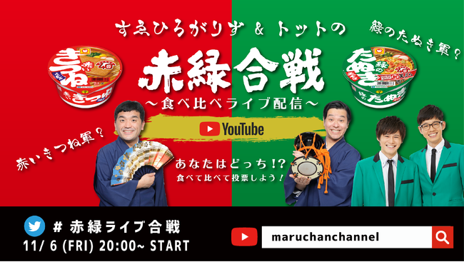 人気お笑い芸人「すゑひろがりず」さんと「トット」さんによるライブ配信イベント。和風カップ麺である赤いきつね緑のたぬきとすゑひろがりずさんの独特な言い回しが見事にマッチし、大きな盛り上がりをみせました。