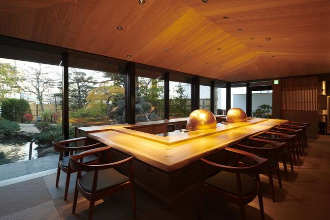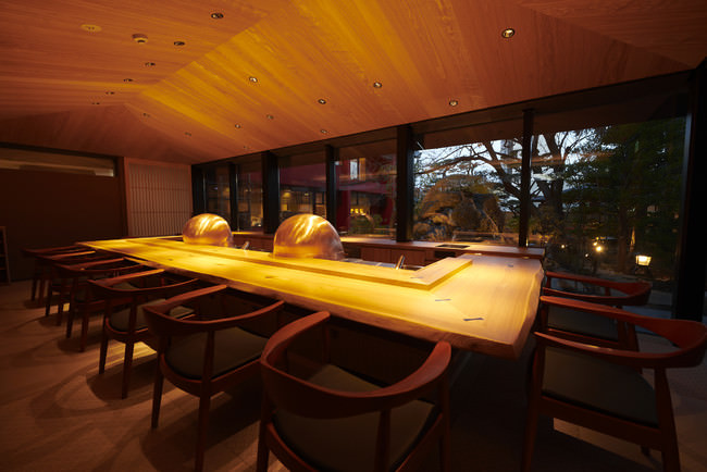 カウンター越しの和風庭園からは、北海道の四季折々の風情を感じることができるのも