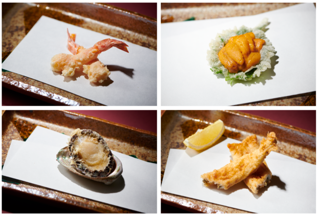 北海道産蝦夷あわび、⼤葉⽣うに(海苔の場合もあり)、えびのかき揚げ(天茶)など