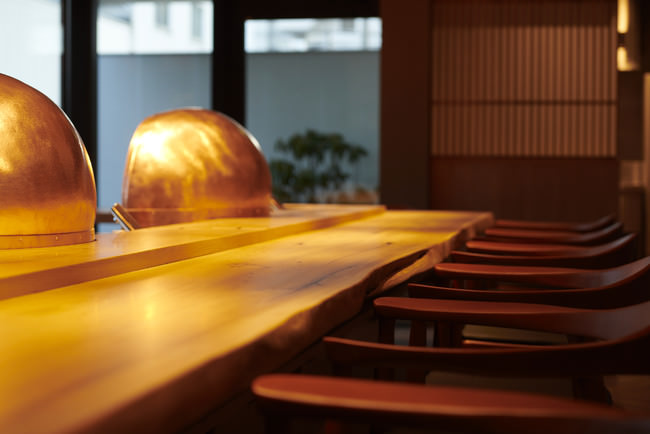 カウンターの後ろには、季節の移り変わりを感じられる和風庭園。カウンターならではのライブ感で、