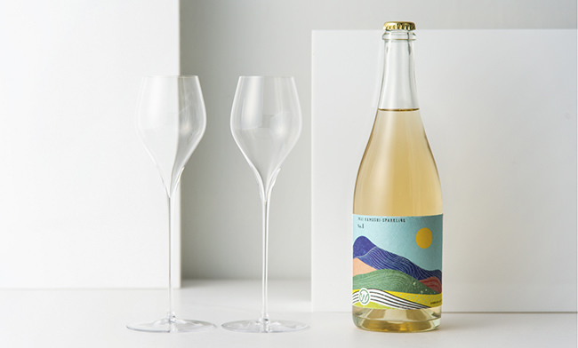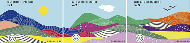 日本ワインの発祥の地「祝村」のブドウ畑風景をイメージしたラベルデザイン。ジャパネスクな表現をベースに新しさを融合したビビットな色調とアート性を調和させることで和モダンな世界観を表現しました。No.1、No.2、No.3のボトルを並べていくと、ブドウ畑の風景がつながっていくまるで一つの絵画に見えるようなラベルで「IWAI KAMOSHI-SPARKLING」の連続するワインの物語を演出します。
