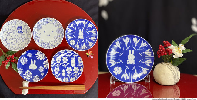 四季折々のお花とミッフィーが描かれた豆皿5枚セットです。豆皿には、四季のお花や名前がついています。